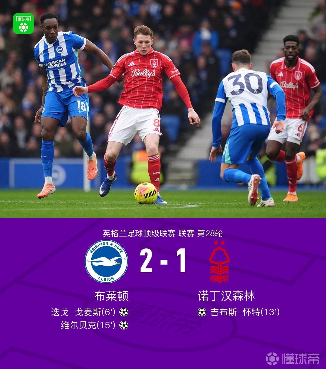 布莱顿2-1诺丁汉森林,戈麦斯、维尔贝克、吉布斯-怀特破门