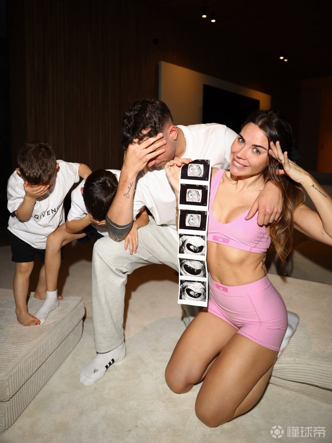 米娜-博尼诺在社交媒体上晒出了一家人的合照,可以看到,她的手上拿着一张B超照片,预示着夫妻俩将迎来第三个孩子,此前米娜-博尼诺在接受采访时就透露,他们将迎来一个女儿。
