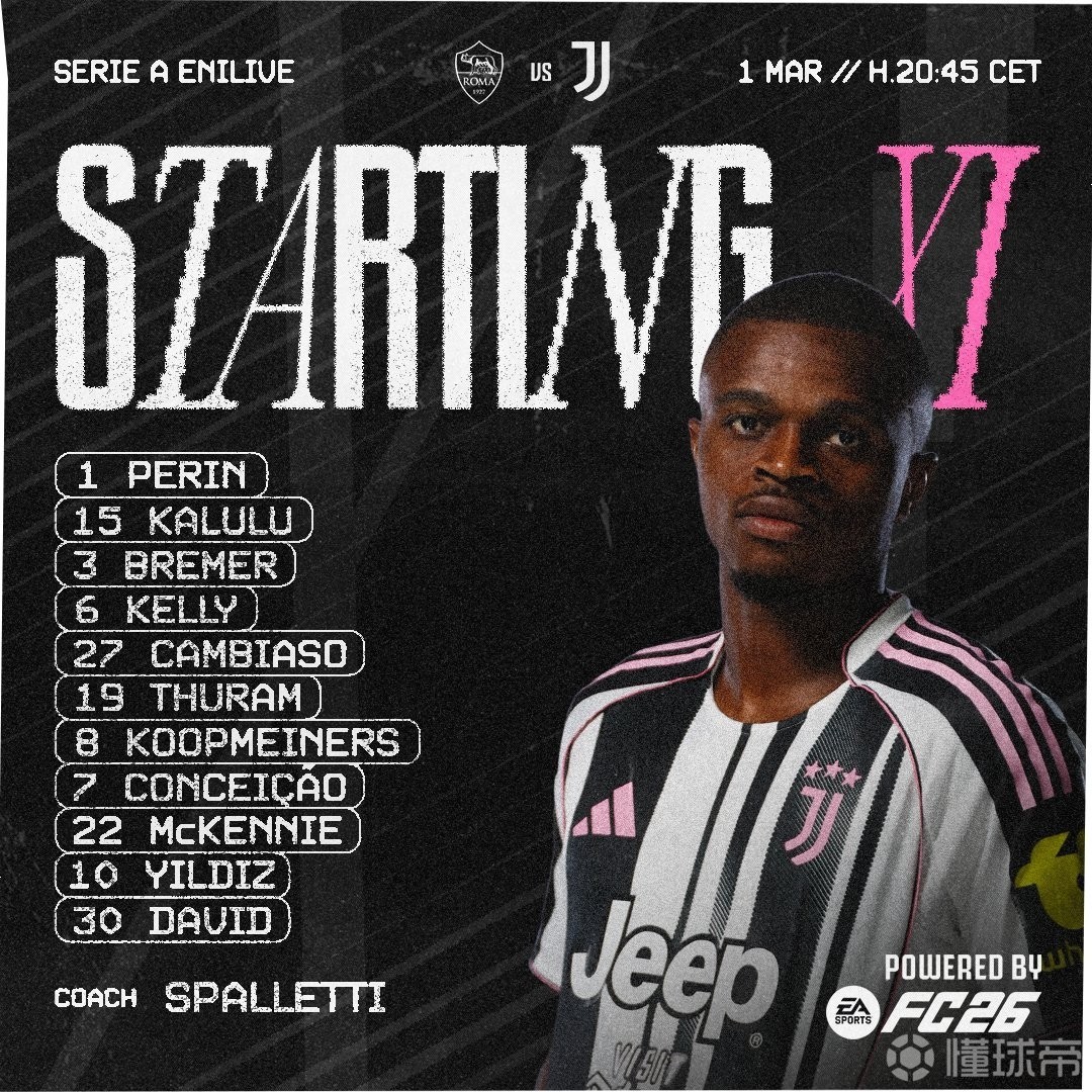 尤文首发:1-佩林、15-卡卢卢、6-凯利、3-布雷默、27-坎比亚索、19-图拉姆、22-麦肯尼、8-库普梅纳斯、10-伊尔迪兹、7-孔塞桑、30-戴维