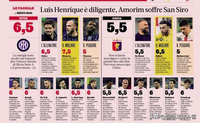 但意媒总喜欢在国米取胜时找些“反面典型”。近期除了巴雷拉之外,就是小图拉姆被批评最多——比如对博德闪耀、热那亚,法国人连续当选“全场最差先生”。